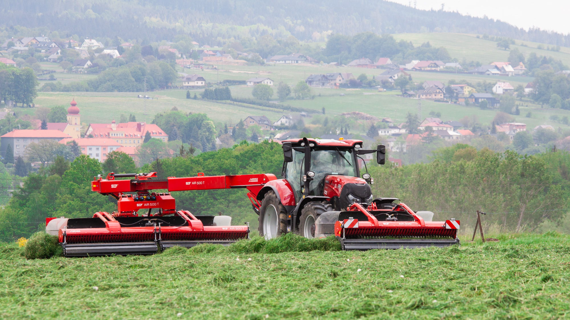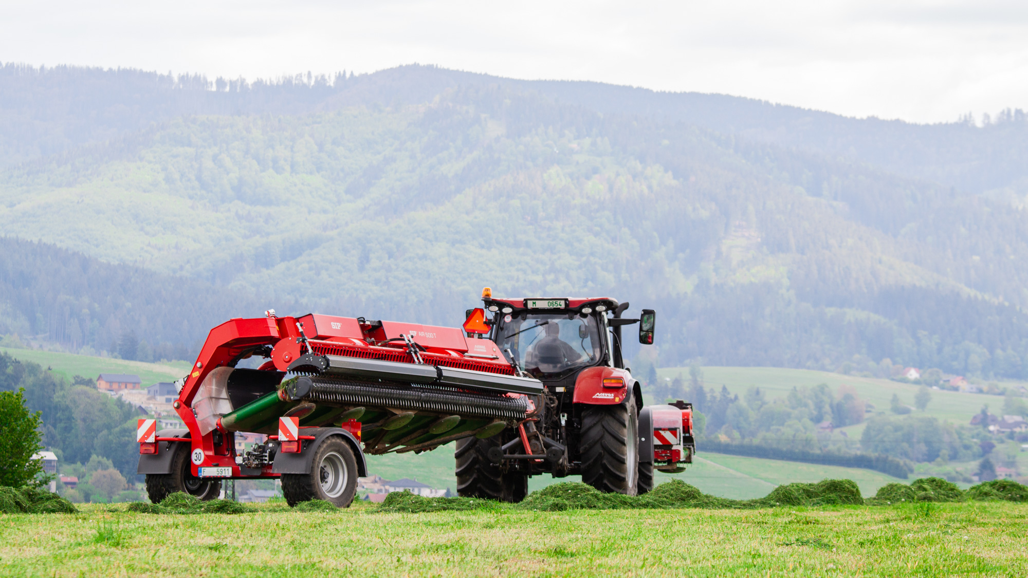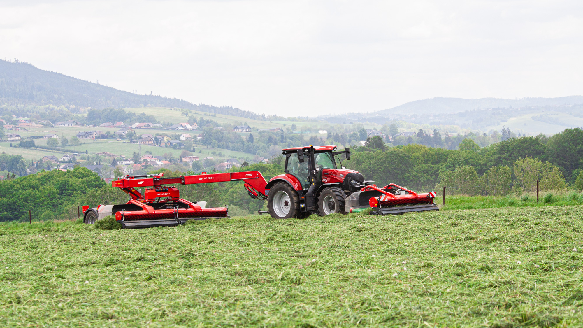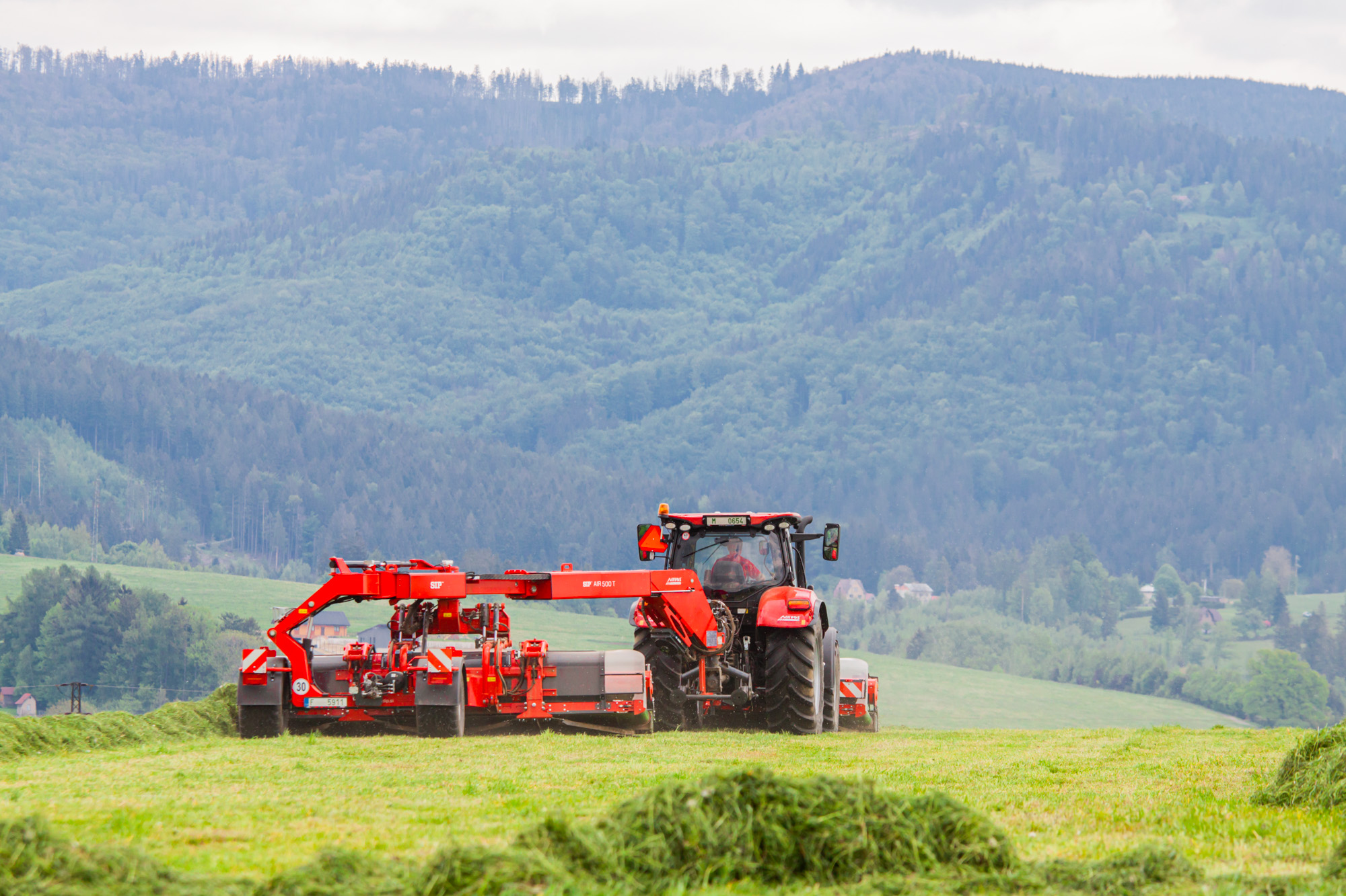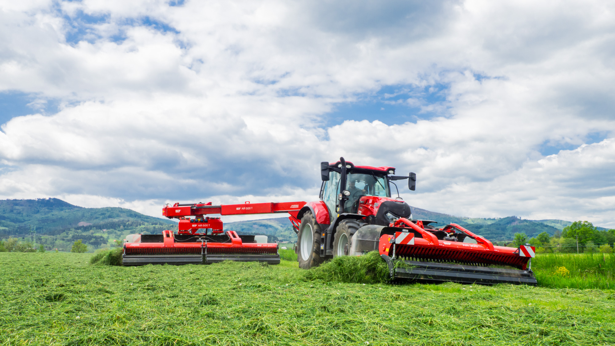 Stranový natáčací pásový zhrňovač krmovín AIR T je ťahaný vedľa traktora. V spojení s čelným zhrňovačom AIR F dosiahnete široký pracovný záber až 8,4 m. Najväčšou prednosťou tejto kombinácie je zhrňovanie krmovín bez kontaktu s kolesami traktora. Stroj umožňuje zakladanie riadku vpravo, vľavo alebo obojstranne, kedy je možné zhromaždiť do jediného riadku enormné množstvo krmovín z veľkej plochy, čo je veľmi efektívne pre následný zber.